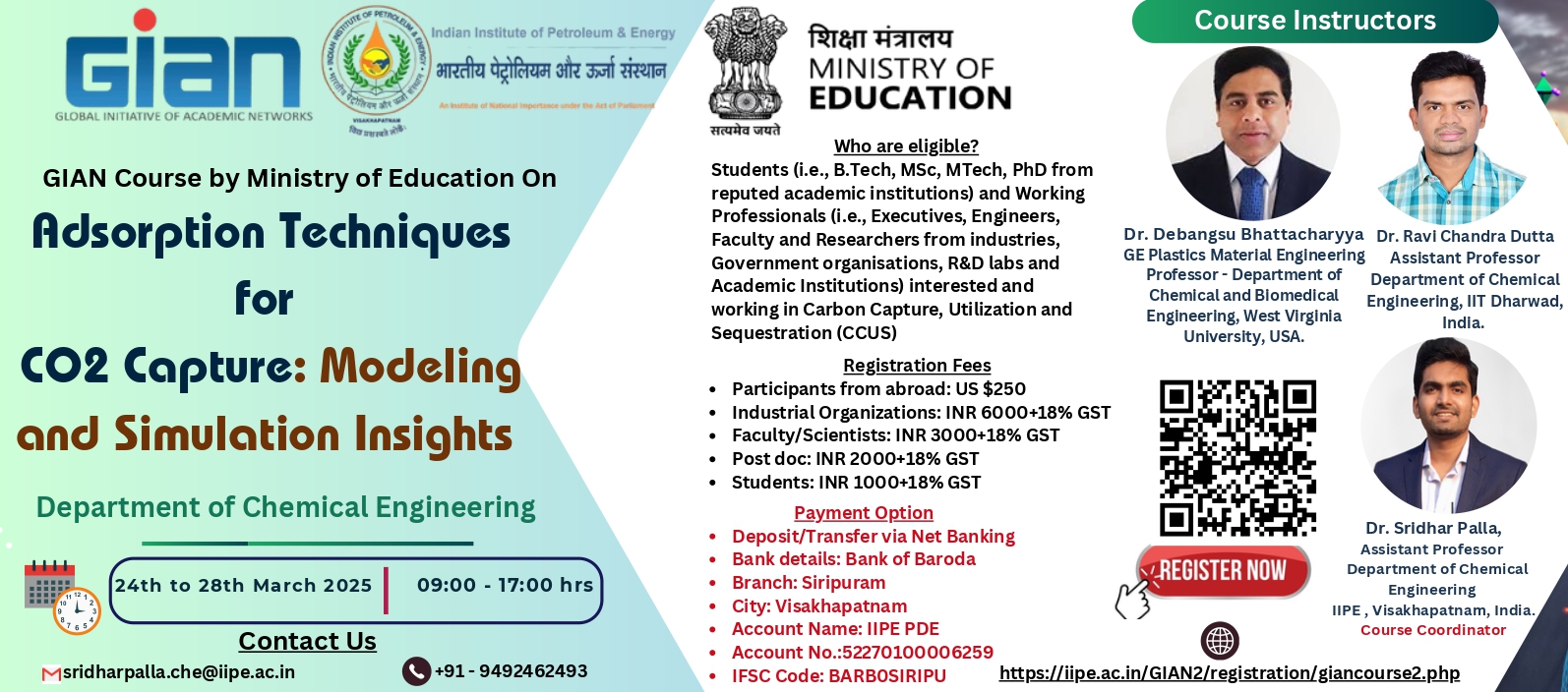 The course will be taught by distinguished international and national academicians and researchers who are well recognized in this field for their experience in research, teaching and consultancy. Industrially relevant case studies will be discussed as part of the tutorial session which provides Hand’s on experience to participants on advanced software tools. This course contribute to the nation's net zero emission goal by training manpower to pursue their career in CCUS.